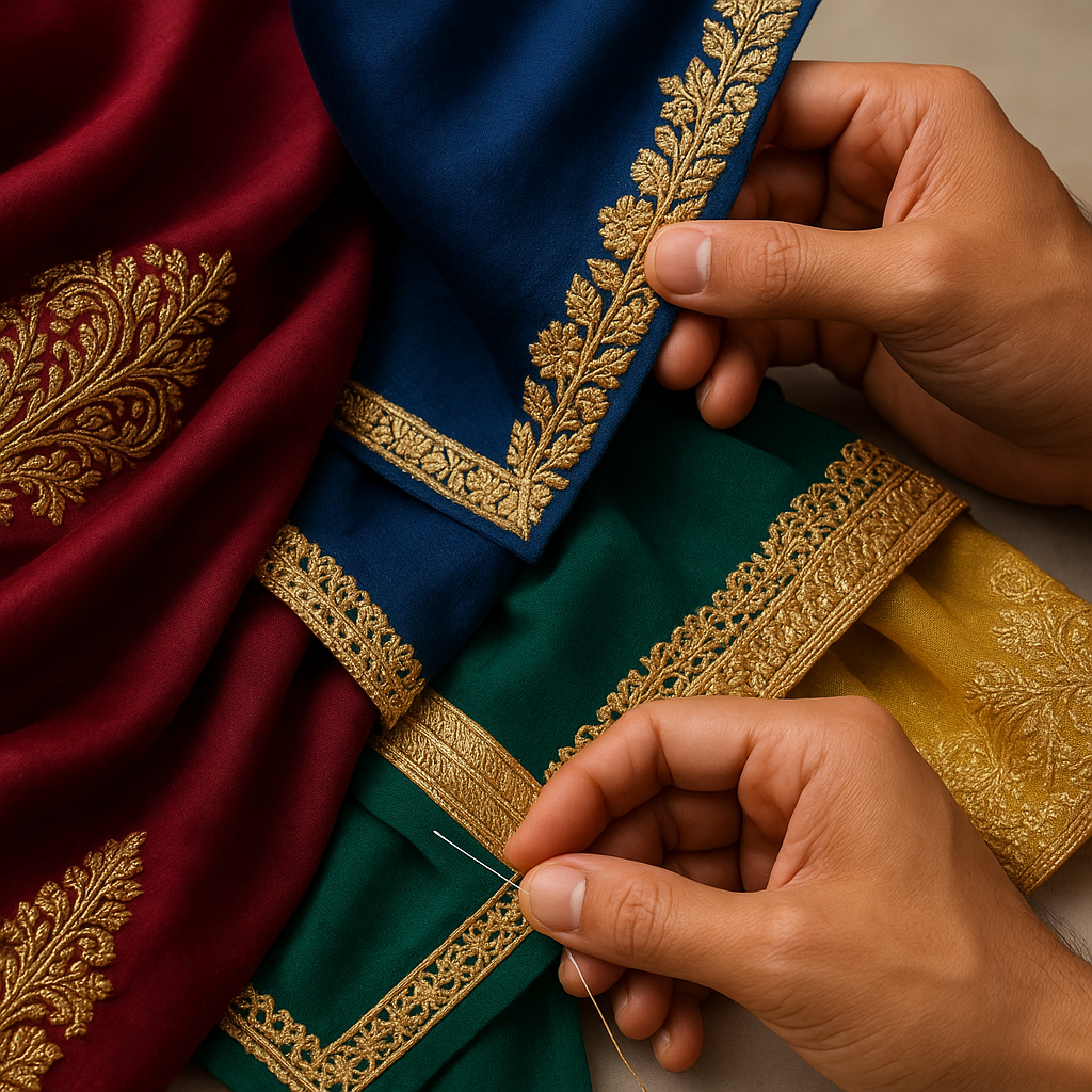 - Custom Placement Design: Strategic positioning on sleeves, hems, necklines, dupattas, and saree borders