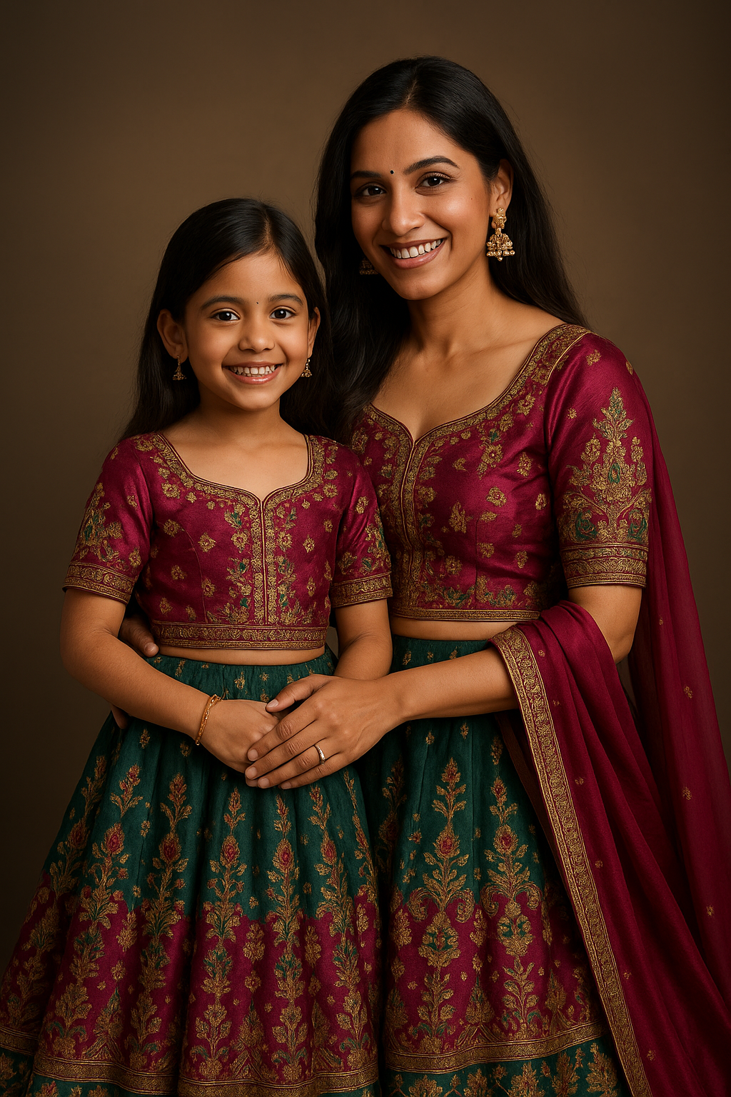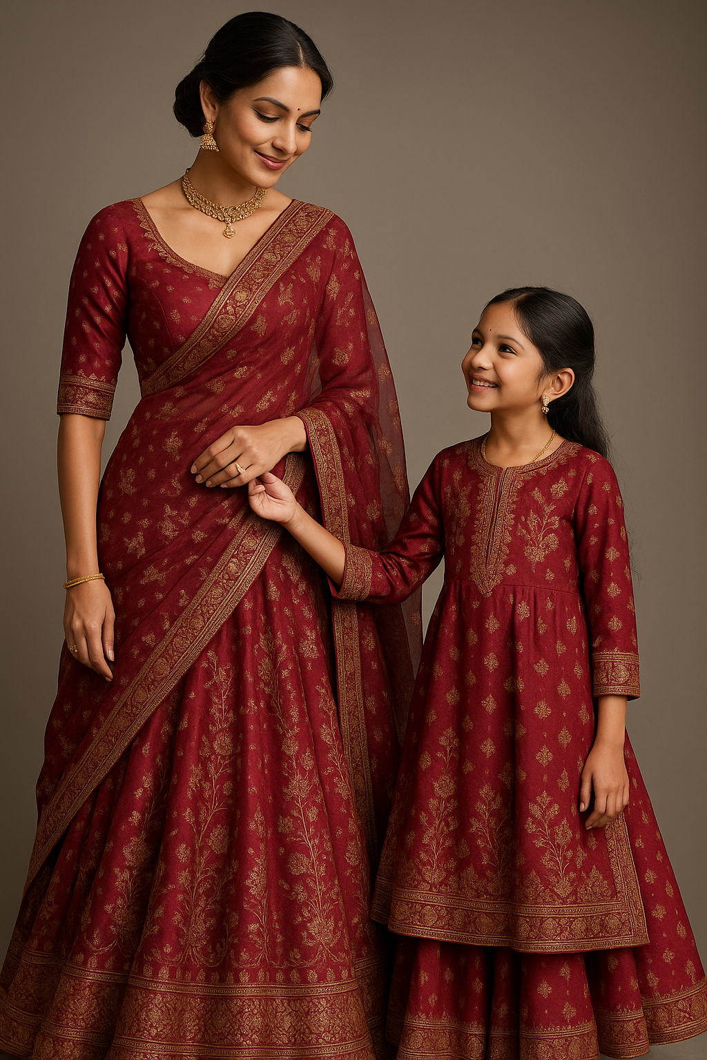 We adapt the chosen design to suit both figures appropriately – perhaps a full-length anarkali for mom with a shorter, more playful version for daughter, or coordinated lehenga sets with age-appropriate styling.